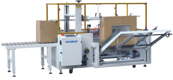 開箱機能對送入的紙板形紙箱自動完成開箱、成形、下底折合蓋箱,并現時完成下部分膠帶粘貼即紙板的箱板自動打開,箱子底部按一定程序折合,并用膠帶密封后輸送給裝箱機的專用設備。自動開箱機是大批量紙箱自動開箱、自動折合下蓋、自動密封下底膠帶的流水線設備,本機采用PLC +顯示屏控制,大大方便操作、管理、減少生產人員和勞動強度,是自動化規模生產必不可少的設備。操作方便,降低包裝成本。可配熱熔膠機封箱。